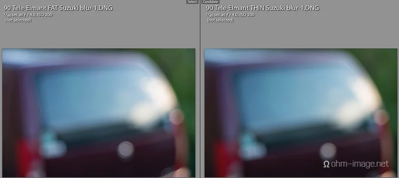 I focused both lenses at 1 metre to illustrate close-distance bokeh. The subject, a 2007 Suzuki Alto (kei car), is immaterial. Again, Thin shows less hard outlining, smoother transitions, and noticeably smoother blur in extremely defocused areas (foliage).